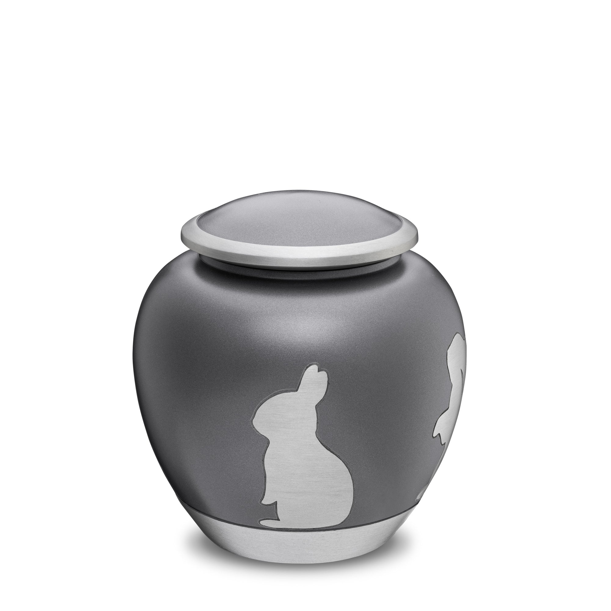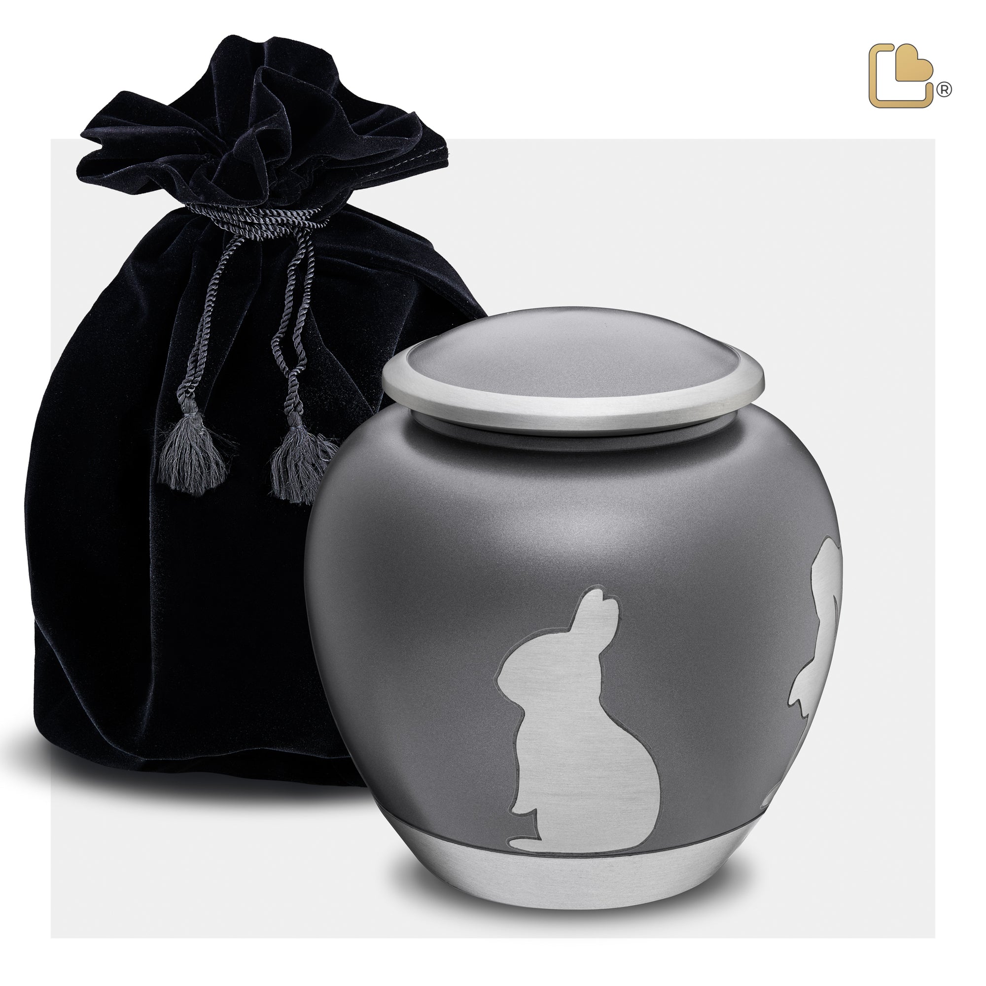 Artistically crafted from high-quality alloy, this urn features a durable Soft Coat finish that enhances its beauty while protecting it from wear. The elegant French Grey color, paired with refined Brushed Pewter accents, creates a soothing and sophisticated aesthetic. The urn's lid is adorned with a delicate paw print, symbolizing the cherished memories and companionship you experienced with your pet. Handcrafted with love by LoveUrns, each urn is an example of quality and artistic craftsmanship. This rabbit funeral urn can hold up to 62 cubic inches of ashes.