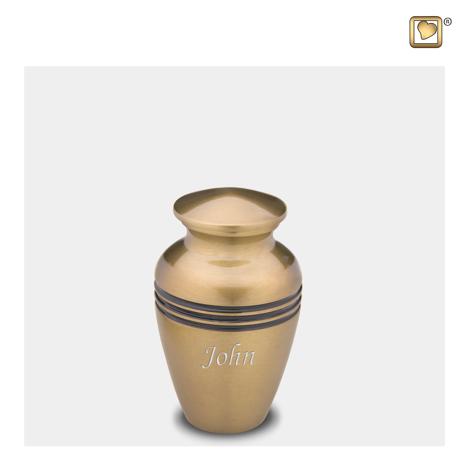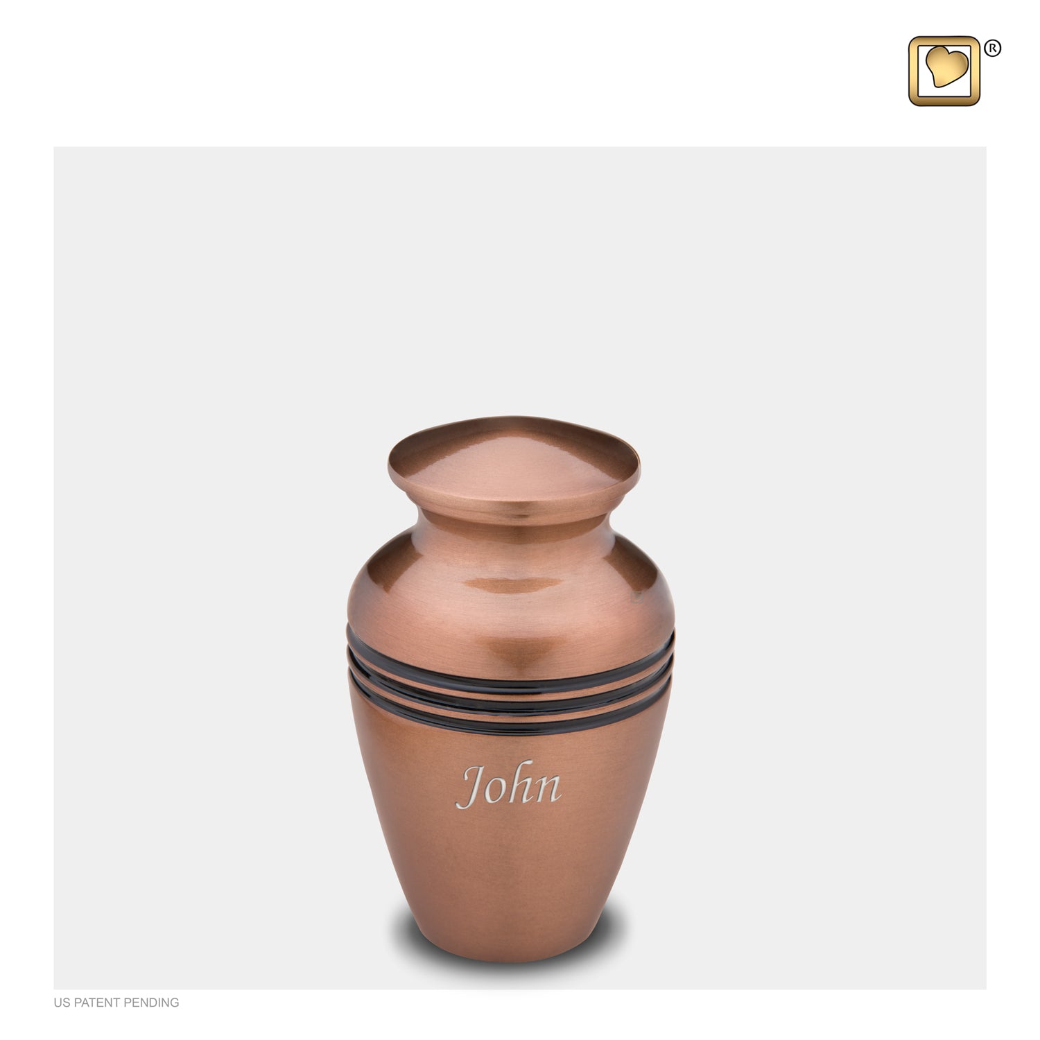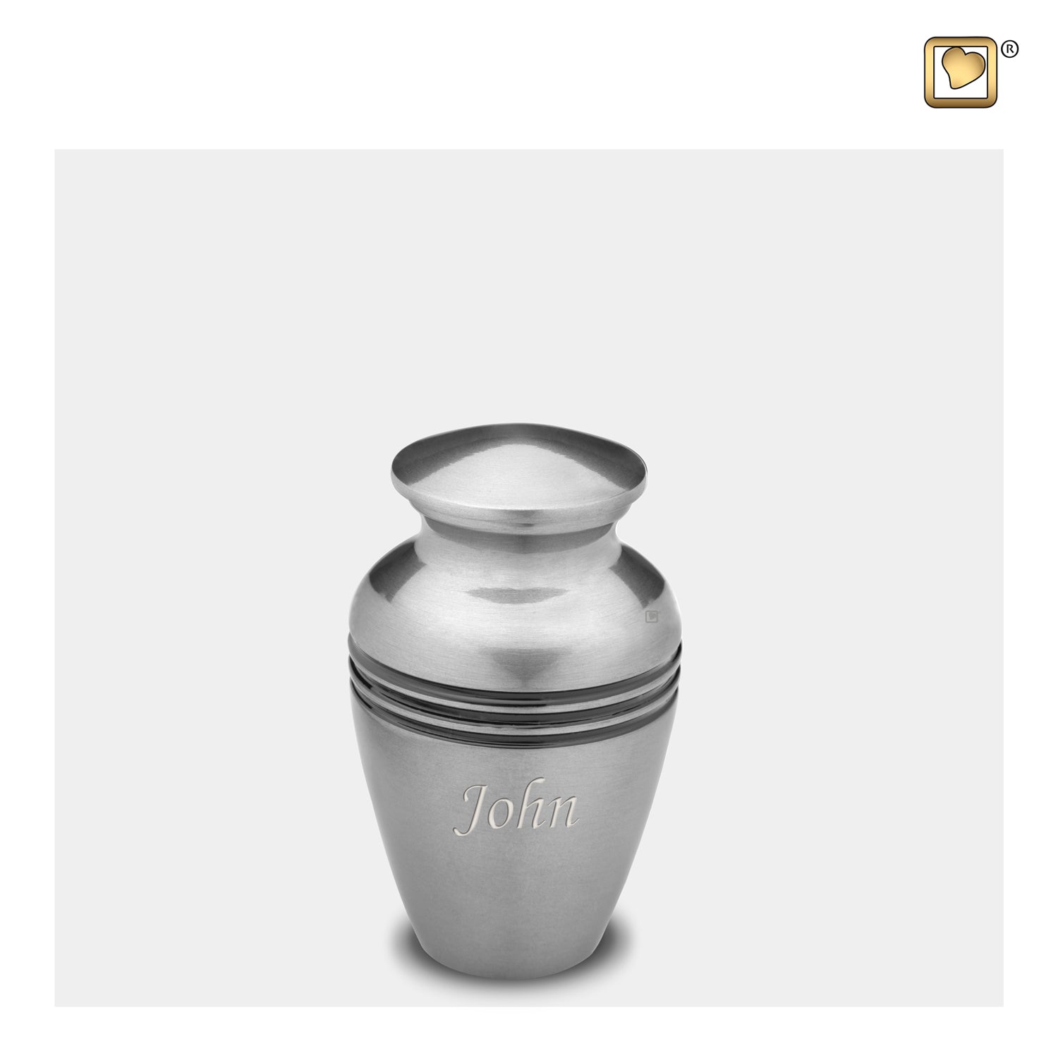 The cremation urns of this collection include the more traditional style of an urn, with the body, neck, and top curved into a recognizable urn shape. There are two key features of the urns in this collection: the simple banding as a design element and a brushed metallic coating.
