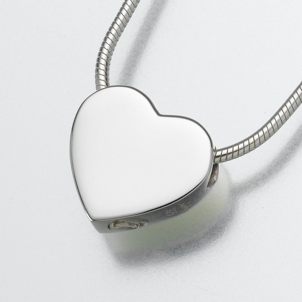 This contemporary heart has squared edges and is a slide design where the chain passes through the body of the pendant. It is filled through a screw on the bottom edge of the heart. Each piece of cremation jewelry can hold a small amount of cremation ashes.