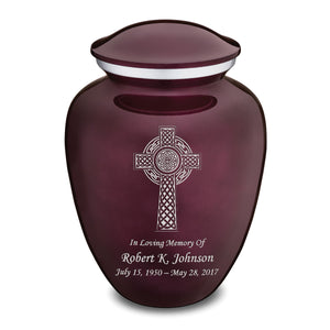 Honor the memory of your loved one with an Adult Embrace Celtic Cross Cremation Urn for Ashes. This beautiful urn displays an ornate Celtic Cross. This is a perfect resting place for someone of Irish heritage as this is a very important religious symbol with a deep and rich history. This Embrace Urn has a rich glossy cherry purple finish with a brushed pewter band just below its threaded lid. The cherry purple coloring represents happiness, loyalty, and devotion. This gorgeous urn also has the option available for custom engraving to offer personalized tribute. Type up to three lines of text with any of our available fonts.