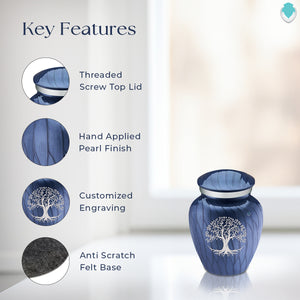 This Embrace Urn has a hand applied pearlescent cobalt blue finish with a brushed pewter band just below its threaded lid. The blue coloring freedom, inspiration, loyalty and devotion.