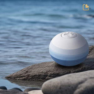 This urn has a soft, rounded “pebble” silhouette that sits calmly in the hand and looks serene in any setting. The color fades in soothing bands from crisp white at the top into light sky-blue and deeper aqua at the base — like quiet water meeting shore. The surface appears matte and natural (not glossy), with a smooth clay feel and subtle handcrafted texture. On the lid, a small raised pawprint is delicately pressed in — a simple, tender detail that makes it unmistakably pet-honoring.