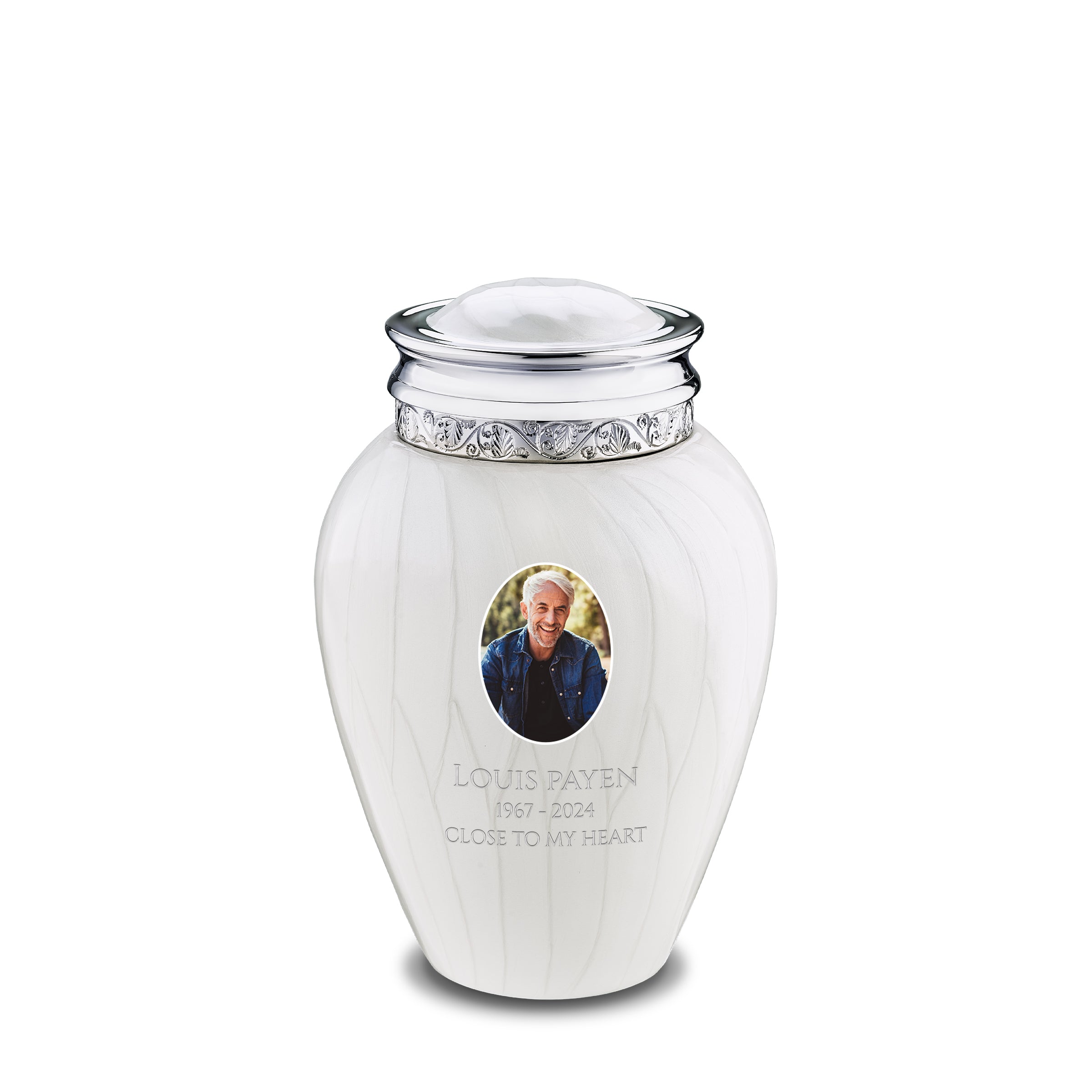 Artistically handcrafted by skilled artisans from high-quality brass alloy, this medium funeral urn can hold up to 42 cu. inches of ashes. The gentle contrast between the white body and the smooth, polished silver lid evokes a sense of peace and positivity, ideal for commemorating the uplifting essence of a loved one. The refined silver neck complements the white pearl base perfectly, bringing a sense of unity and sophistication to the design. Encircling the neck is an intricate ribbon of hand-engraved vines and leaves, adding a natural and graceful element to the urn. This exquisite detail not only enhances the urn’s aesthetic but also symbolizes the interconnected nature of life and memory.