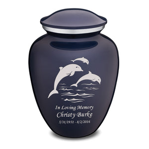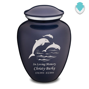 Honor the memory of your loved one with an Adult Embrace Dolphins Cremation Urn for Ashes. This beautiful urn displays three dolphins jumping into the ocean. The dolphins represent harmony, peace, and is the perfect resting place for someone fond of marine life or the ocean.