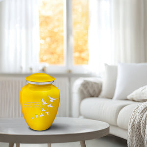 This Embrace Urn has a deep glossy yellow finish with a brushed pewter band just below its threaded lid. The yellow coloring represents sophistication, strength, and power.