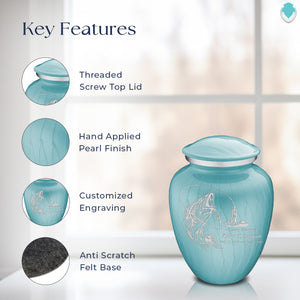 This Embrace Urn has a hand applied pearlescent blue finish with a brushed pewter band just below its threaded lid. The baby blue coloring represents innocence, playfulness, and softness.