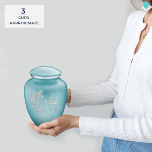 Honor the memory of your loved one with the Embrace Fishing Cremation Urn for Ashes. This beautiful urn displays a scene of a fisher catching a prized fish. This is a perfect resting place for someone who embodied nature, peace, wisdom, and endurance.