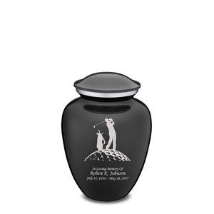 Honor the memory of your loved one with a Medium Embrace Golfer Cremation Urn for Ashes. This beautiful urn displays a scene of a golfer swinging a club. This is a perfect resting place for someone who enjoyed golfing.