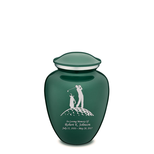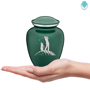 Honor the memory of your loved one with a Medium Embrace Golfer Cremation Urn for Ashes. This beautiful urn displays a scene of a golfer swinging a club. This is a perfect resting place for someone who enjoyed golfing.