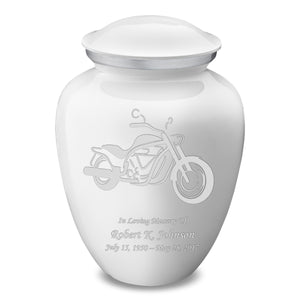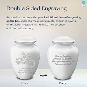 Honor the memory of your loved one with an Adult Embrace Motorcycle Cremation Urn for Ashes. This beautiful urn displays a silver motorcycle. This is a perfect resting place for a free spirit, someone who enjoyed riding the open road.