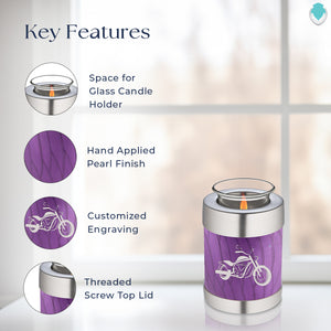 This Embrace Urn has a hand applied pearlescent purple finish with a brushed pewter band just below its threaded lid. The pearlescent purple coloring represents peace, luxury, nobility and devotion.