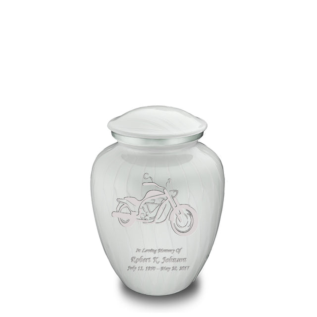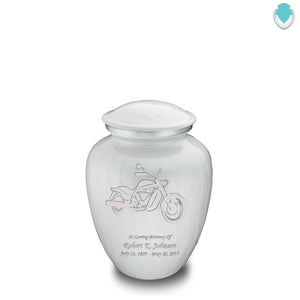 Honor the memory of your loved one with the Embrace Motorcycle Cremation Urn for Ashes. This beautiful urn displays a silver motorcycle. This is a perfect resting place for a free spirit, someone who enjoyed riding the open road.