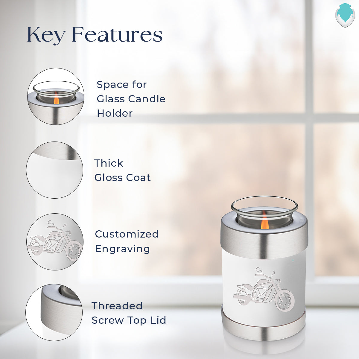 Yes, we offer a variety of urns designed especially for motorcycle enthusiasts. These include engraved motorcycle artwork, scenic riding silhouettes, and fully customizable designs that reflect the spirit of the open road.