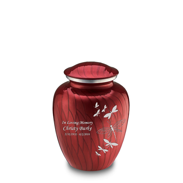 Honor the memory of your loved one with the Embrace Dragonflies Cremation Urn for Ashes. This beautiful urn displays a flight of silver dragonflies moving upwards. This is a perfect resting place for a free spirit, someone who enjoyed life, nature, harmony.