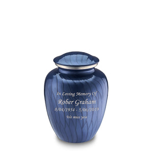 This Embrace Urn has a hand applied pearlescent cobalt blue finish with a brushed pewter band just below its threaded lid. The blue coloring freedom, inspiration, loyalty and devotion.