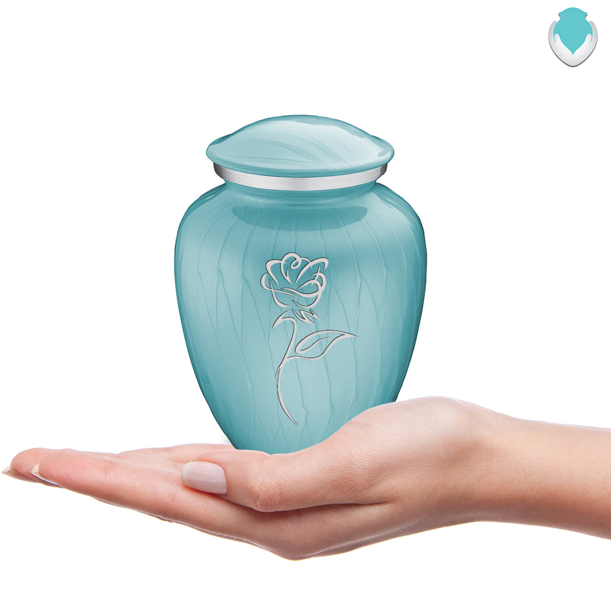 This Embrace Urn has a hand applied pearlescent blue finish with a brushed pewter band just below its threaded lid. The baby blue coloring represents innocence, playfulness, and softness.