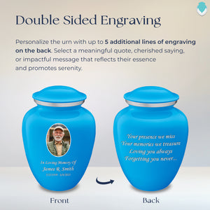 The Embrace Racing Blue Portrait Cremation Urn captures the essence of cherished memories and enduring connections. The vibrant racing blue symbolizes loyalty, depth, and the courage to embrace life fully. Its portrait design creates a timeless tribute, offering a space to commemorate your loved one’s story and honor their individuality with grace and dignity.