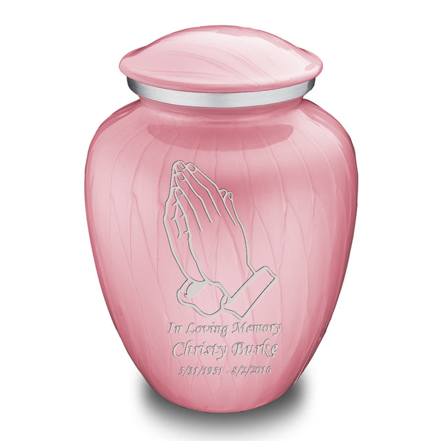This Embrace Urn has a hand applied pearlescent pink finish with a brushed pewter band just below its threaded lid. The pink coloring represents joy, playfulness, and sweetness.