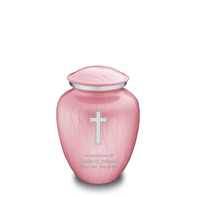 This Embrace Urn has a hand applied pearlescent pink finish with a brushed pewter band just below its threaded lid. The pink coloring represents joy, playfulness, and sweetness.