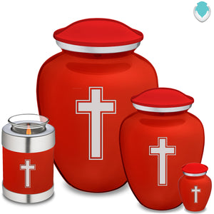 This Embrace Urn has an opaque glossy bright red finish with a brushed pewter band just below its threaded lid. The red coloring represents energy, love, and passion.