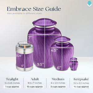 This Embrace Urn has a hand applied pearlescent purple finish with a brushed pewter band just below its threaded lid. The pearlescent purple coloring represents peace, luxury, nobility and devotion. Embrace Pearlescent have a beautiful striated texture across the surface of the urn and lid. These striations are formed by the expert c