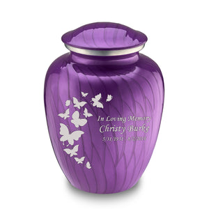 Honor the memory of your loved one with an Adult Embrace Pearl Butterfly Cremation Urn for Ashes. This memorial urn displays a flight of butterflies flying upwards. This is a perfect resting place for someone who embodied endurance, change, and renewal.