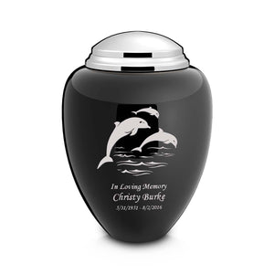 The hallmark of our Tribute Collection is the new, sleek oval silhouette in a selection of rich, gleaming colors accented with mixed metals that can only be found at GetUrns. This cremation urn's luxurious black color and silver cap is aesthetically pleasing, elegant, distinctive, and symbolizes sophistication, strength, and power. This beautiful urn displays three dolphins jumping into the ocean. The dolphins represent harmony, peace, and is the perfect resting place for someone fond of marine life or the ocean.