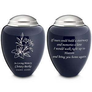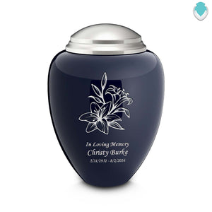 The hallmark of our Tribute Collection is the new, sleek oval silhouette in a selection of rich, gleaming colors accented with mixed metals that can only be found at GetUrns. This beautiful urn displays an elegant lily. This is a perfect resting place for someone who embodied love, hope, and passion. This cremation urn’s sophisticated navy color and graceful brushed silver cap is aesthetically pleasing, ultramodern and symbolizes freedom, loyalty, inspiration, and devotion.