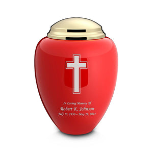 The hallmark of our Tribute Collection is the new, sleek oval silhouette in a selection of rich, gleaming colors accented with mixed metals that can only be found at GetUrns. This beautiful urn displays a simple cross. This is the perfect resting place for someone with unwavering faith and devotion. This cremation urn’s red body and gold cap is aesthetically pleasing, elegant, distinctive, and symbolizes confidence, courage, wisdom, and spirituality.