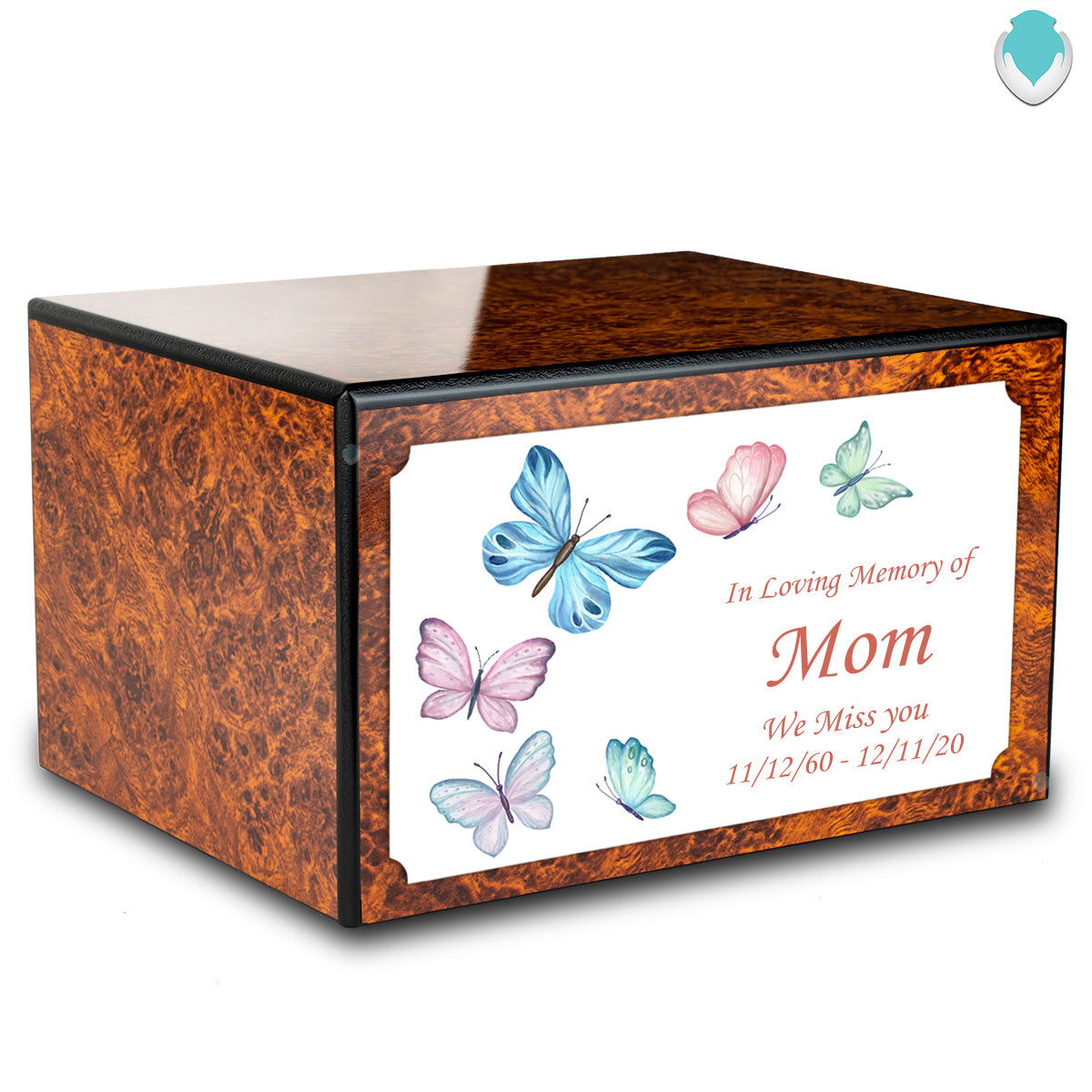 The Custom Printed Heritage Butterflies Burl Wood Box Cremation Urns are elegant and modern in design. This Heritage Urn for ashes displays a line of vibrant colored butterflies ascending in flight towards the sky.