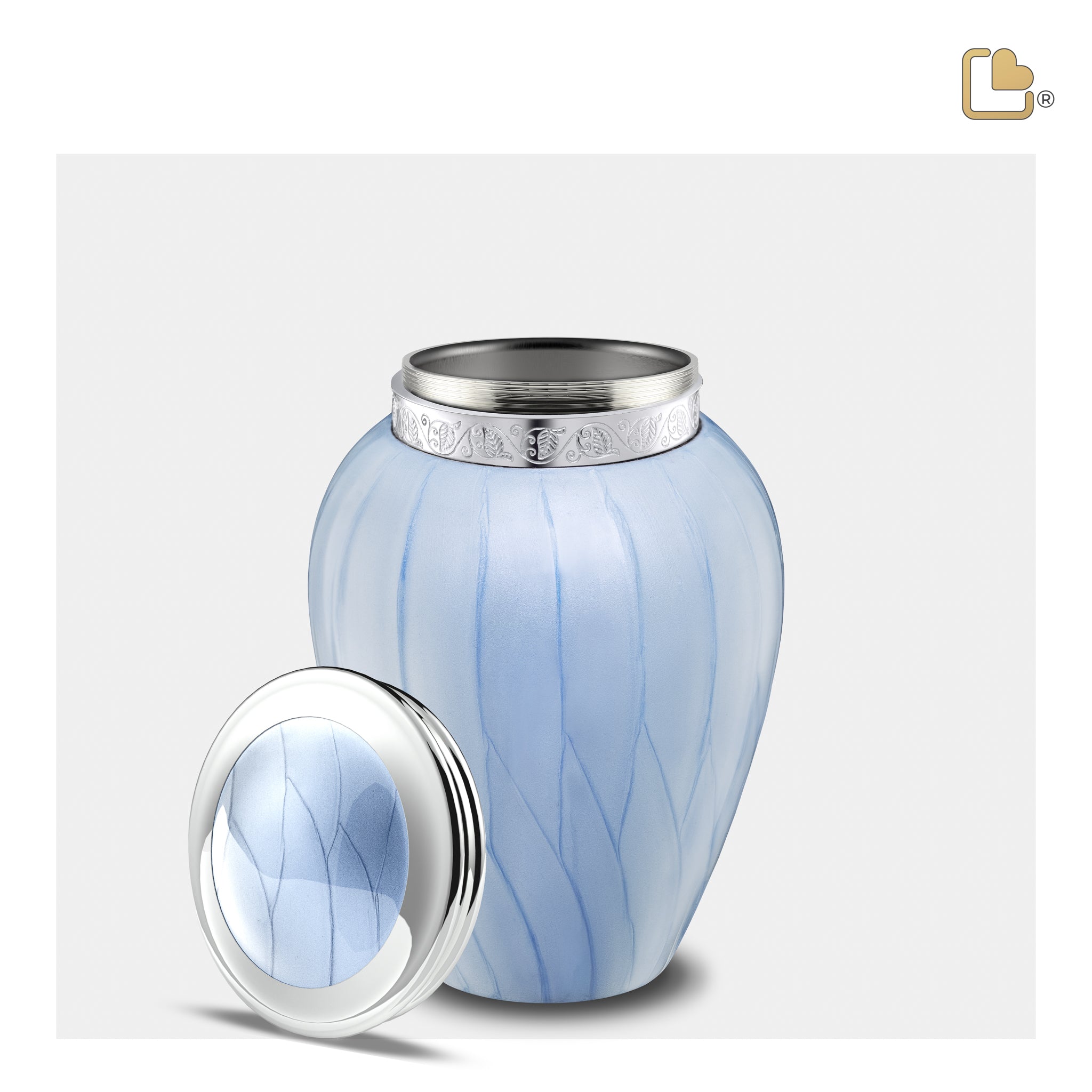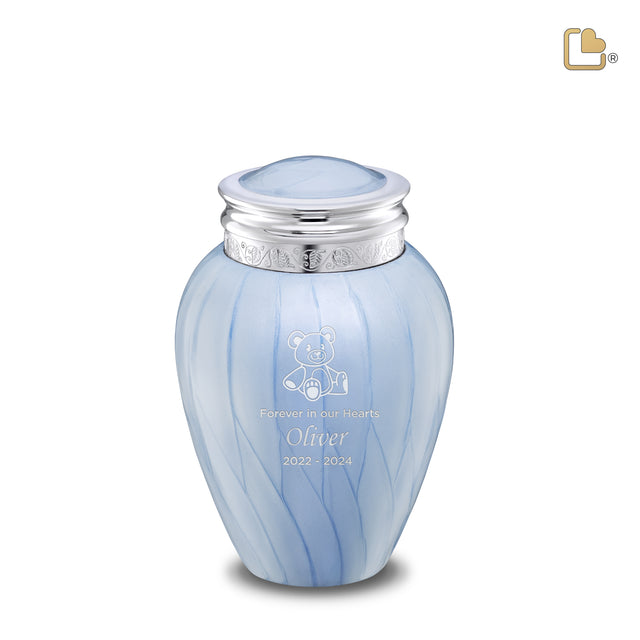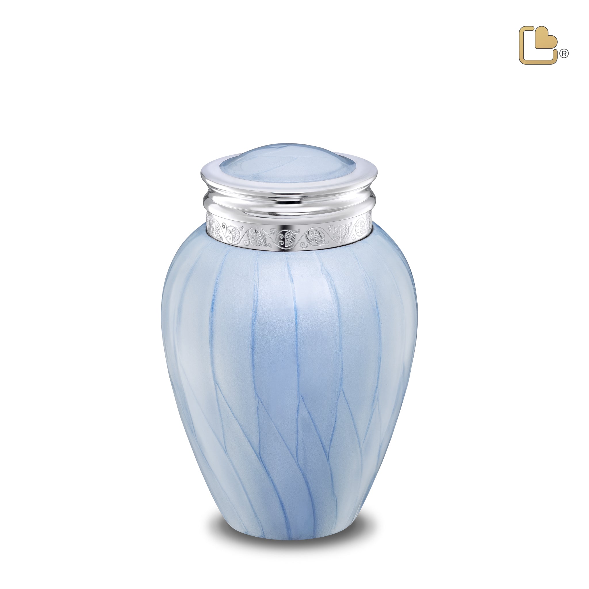 The light blue pearlescent brush stroke design is a statement of innocence and loving memories. And, enhanced by the brilliant, polished silver accents, this medium urn designed for small children is palatial and impressive. A swirl of trailing ivy leaves is engraved around the silver band embellishment, a nature-inspired element which adds depth and a timeless accent.