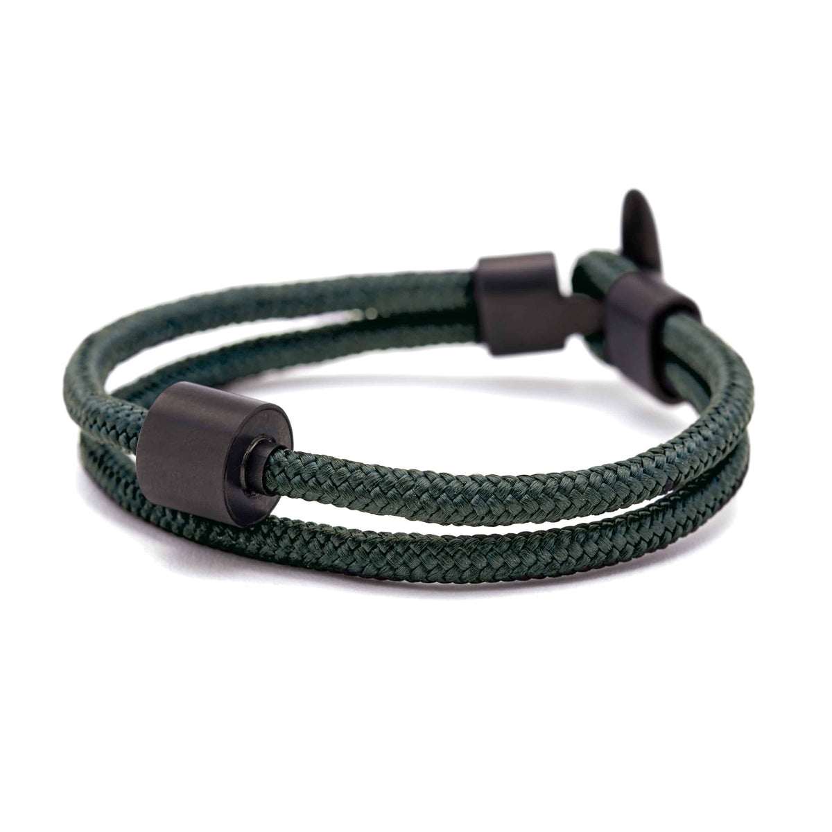 The piece features a traditional naval rope in a combination of black and petrol green, which is braided and intertwined together to prominently display the dual-color combination. The colors pair perfectly with the 316 stainless-steel accents, one of which is a unique cylinder design that encloses a small pinch of ashes to allow the wearer to keep some remains from their loved one close.