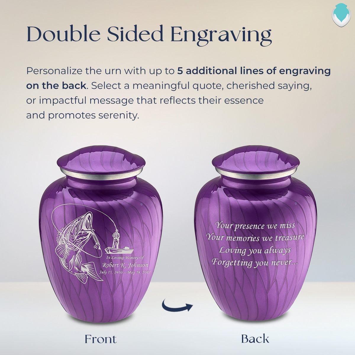 This gorgeous urn also has the option available for custom engraving to offer personalized tribute. Type up to three lines of text with any of our available fonts. Note: all custom engraved text is final and will be engraved as submitted.