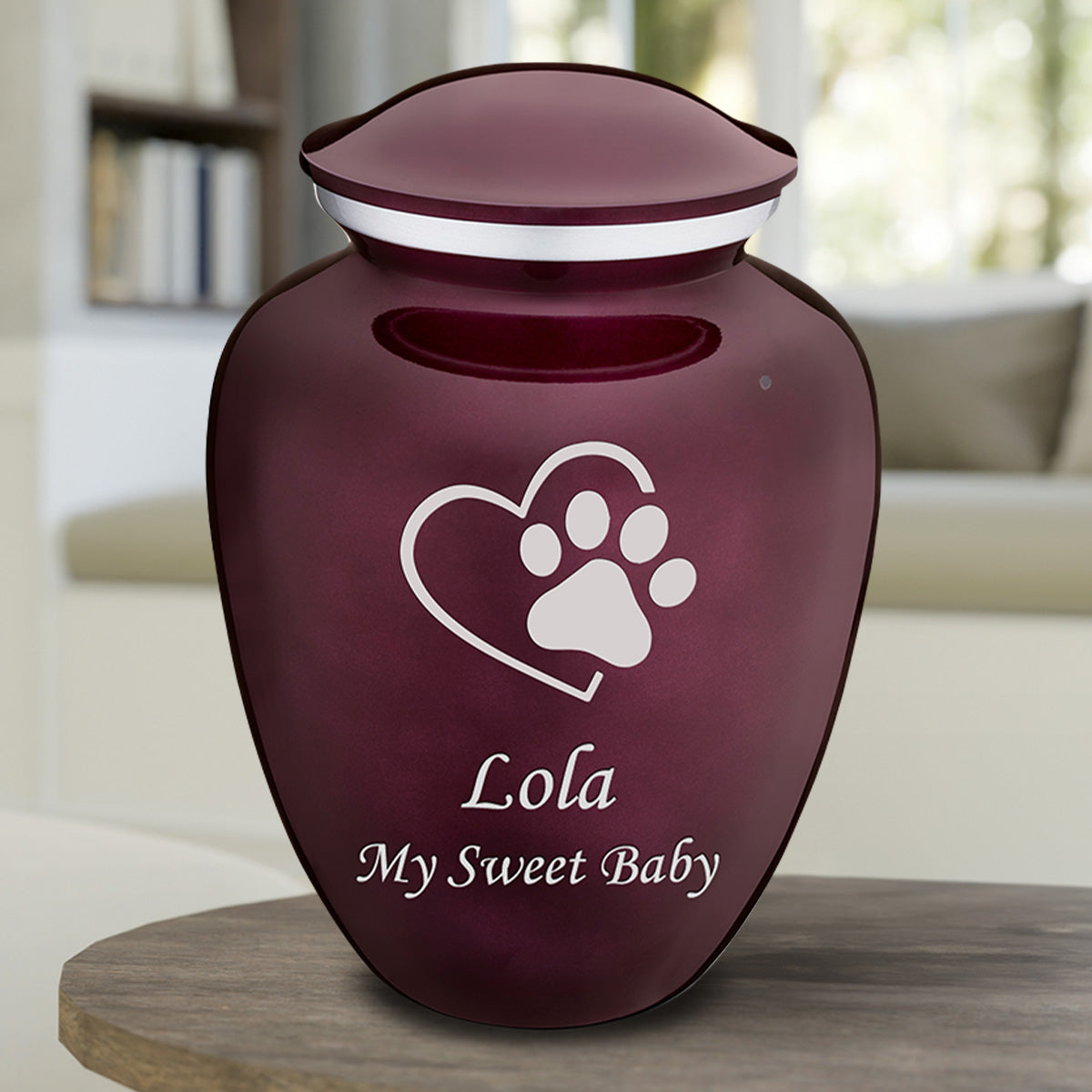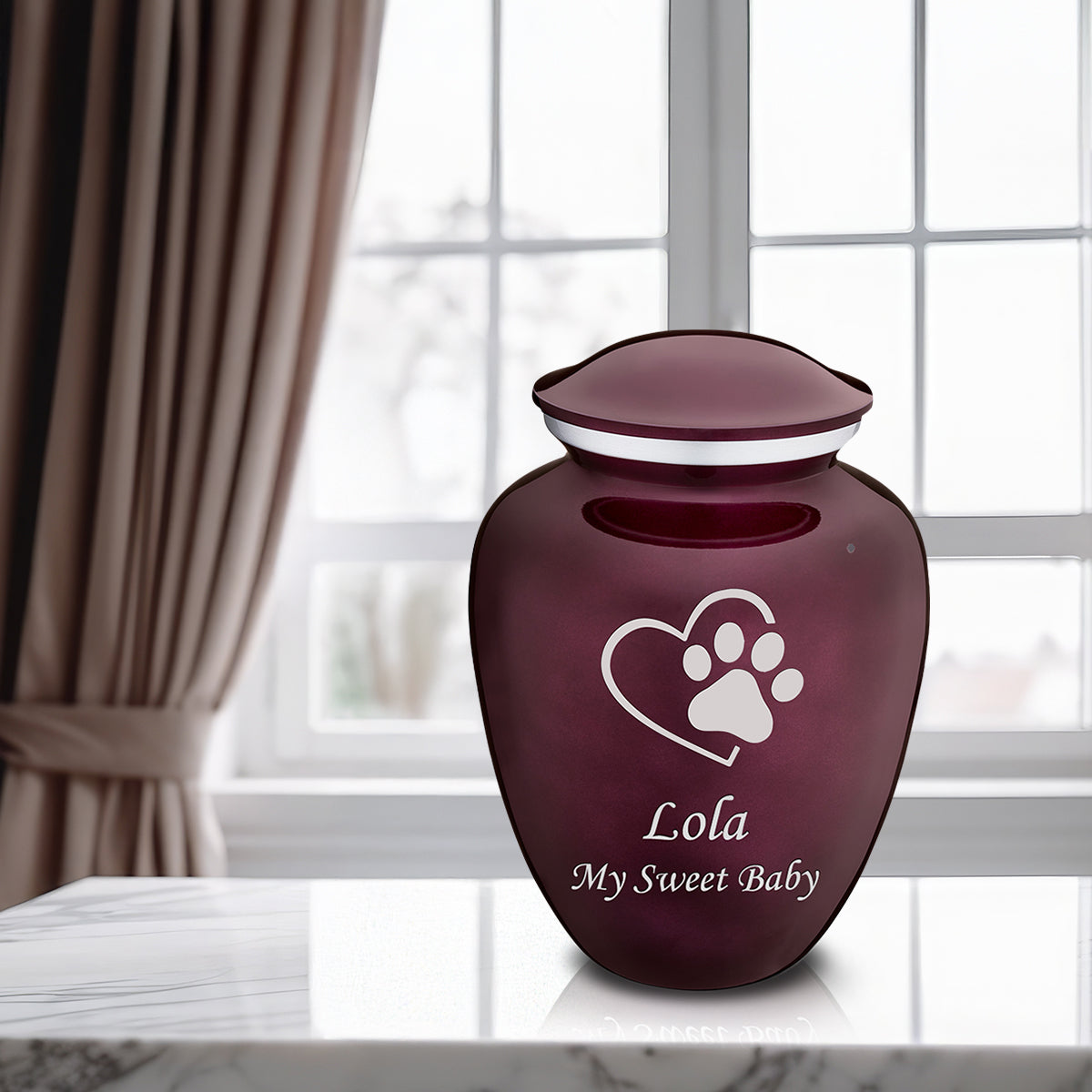 This Embrace Urn has a rich glossy cherry purple finish with a brushed pewter band just below its threaded lid. The cherry purple coloring represents happiness, loyalty, and devotion.