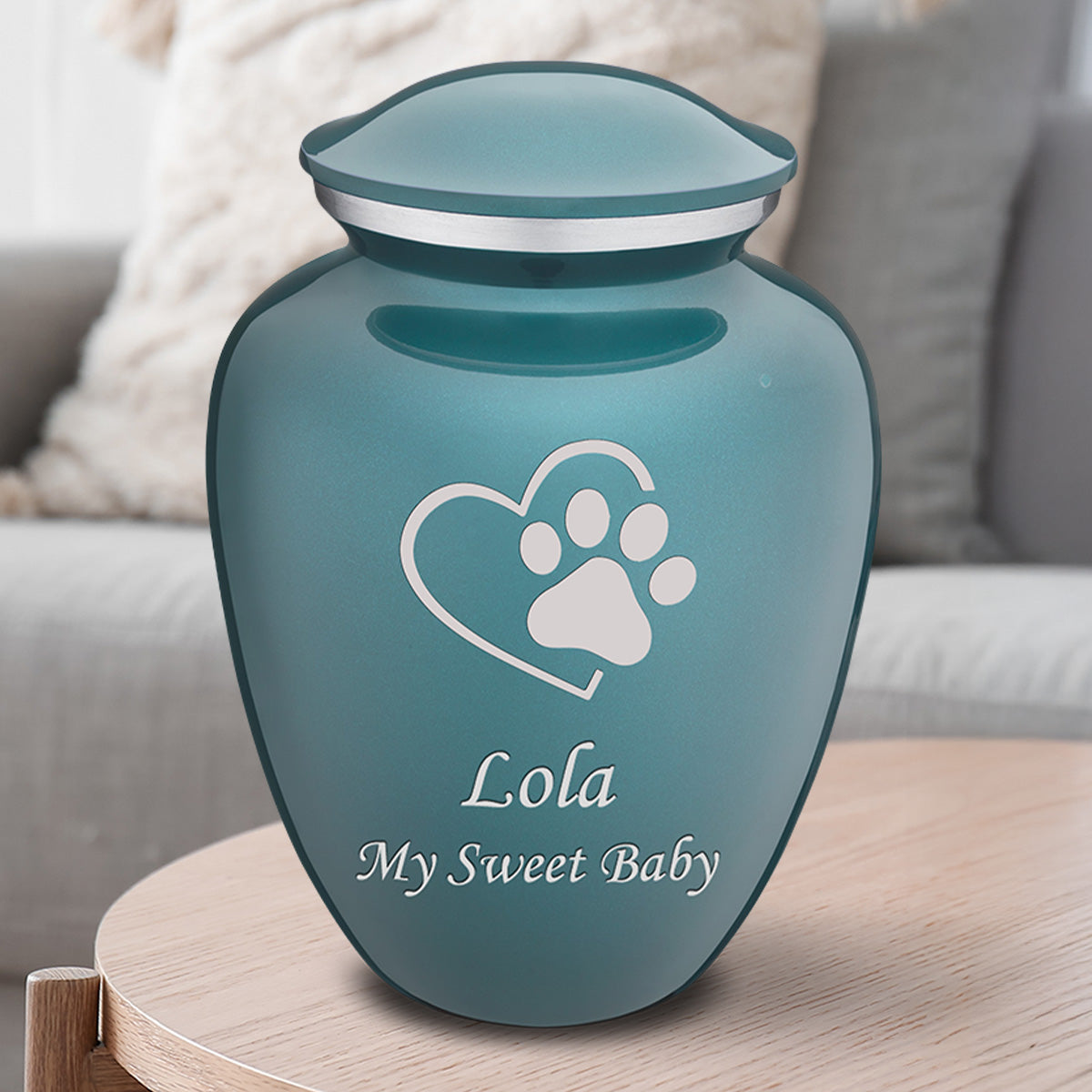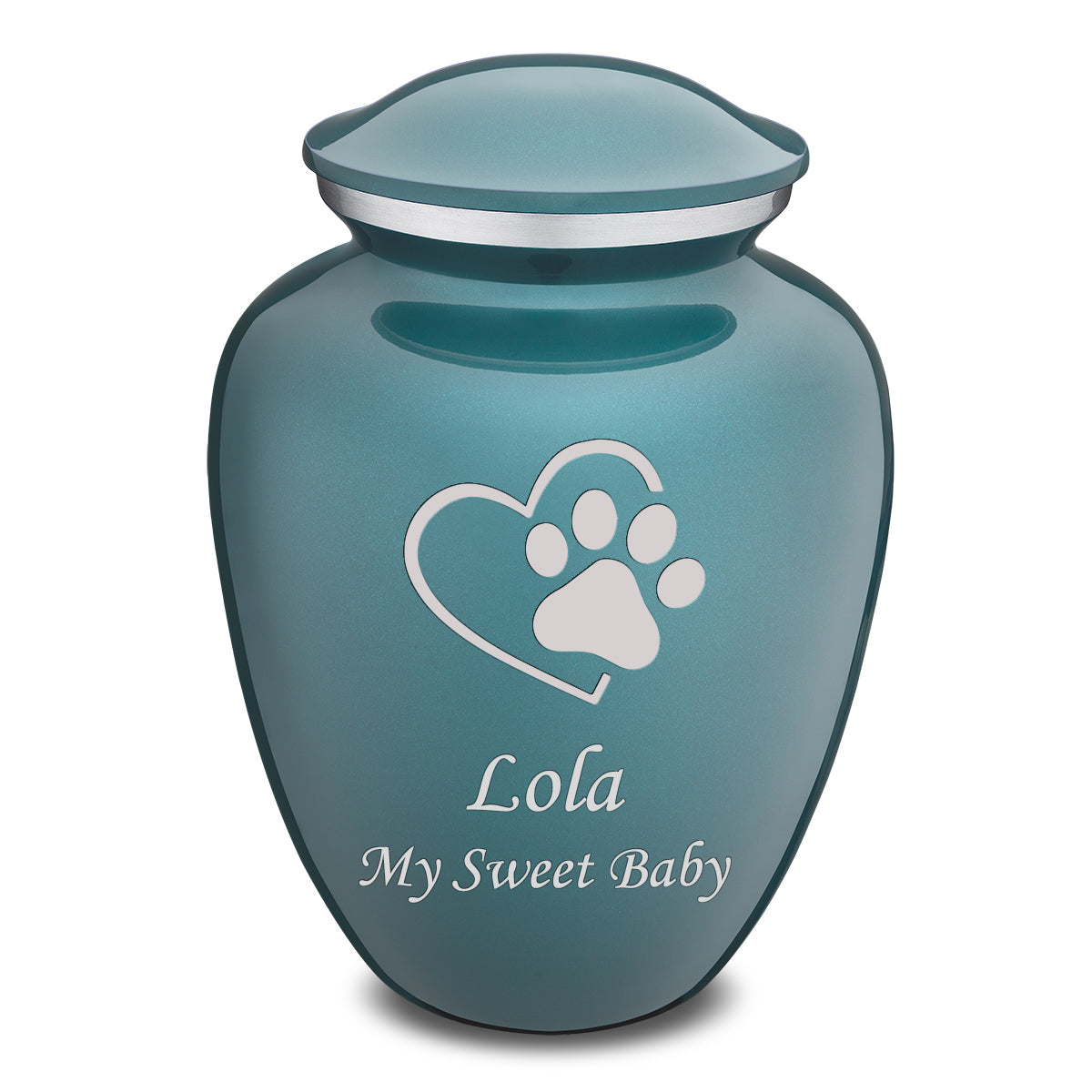 This Embrace Urn has an opaque glossy teal finish with a brushed pewter band just below its threaded lid. The teal coloring represents calmness, strength, and elegance.