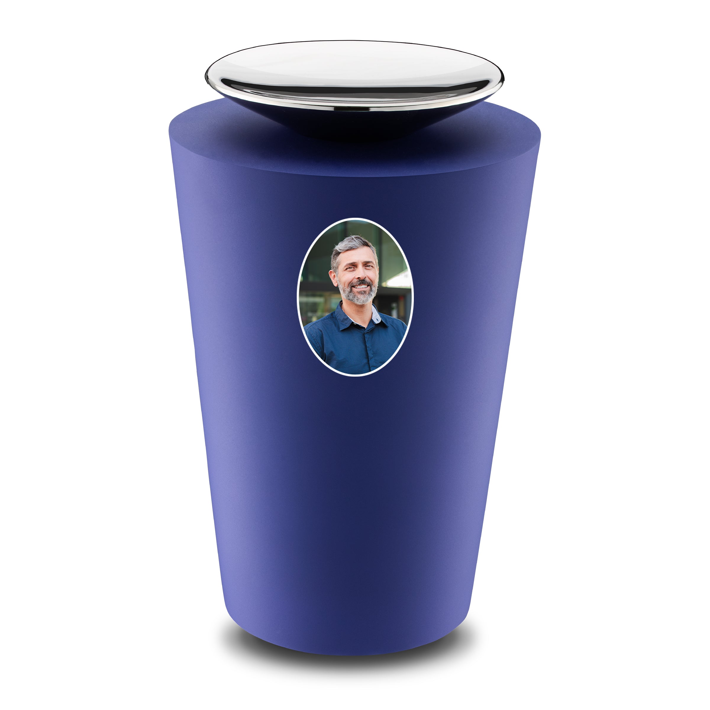 Unique in style, the inverted cone-shaped urn aesthetically captivates the eye in an indigo shade of navy blue. A stunning polished silver cone tops the majestic conical sculpture, accenting the royal blue color of the tall urn while emphasizing the spherical symmetry.