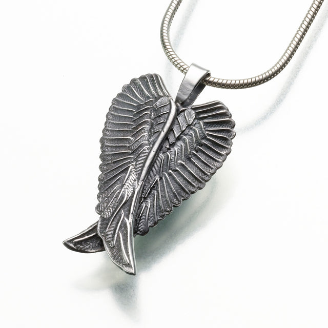 The angel wings have a raised feather pattern on the front. It can be filled through a threaded screw in the middle of the back. Each piece of cremation jewelry can hold a small amount of cremation ashes.