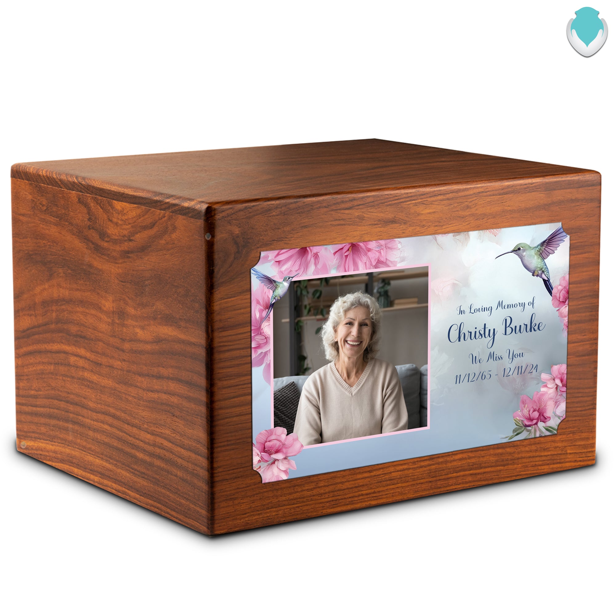 You can personalize your aura cremation urnwith your loved ones name and life dates only, or choose from a variety of brass plaque designs, affixed to the front of the urn itself. From a jumping fish to a hummingbird, from deer, doves, dirt-bikes dolphins, and more, you can choose an image that recalls your loved one’s interests and that will make you smile.
