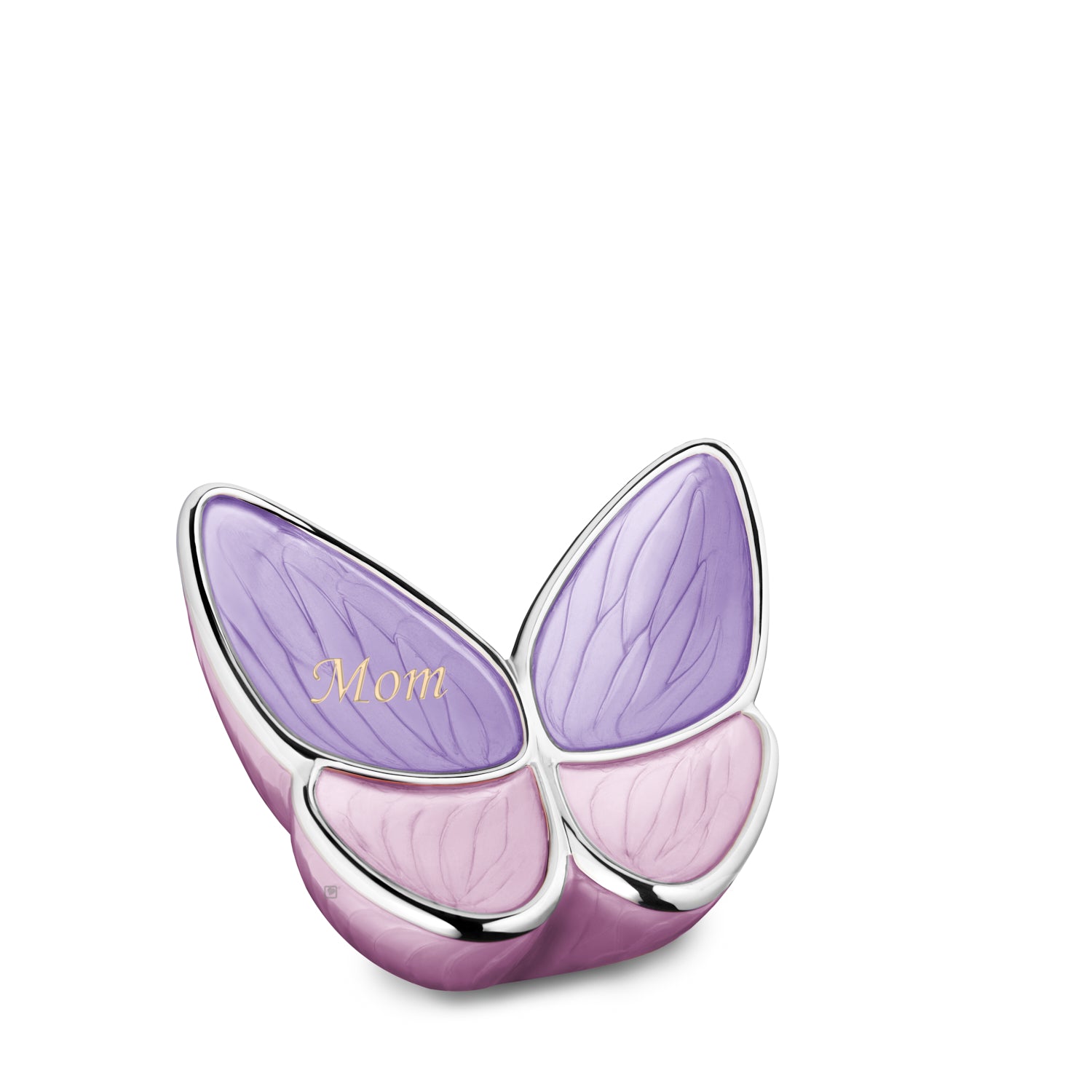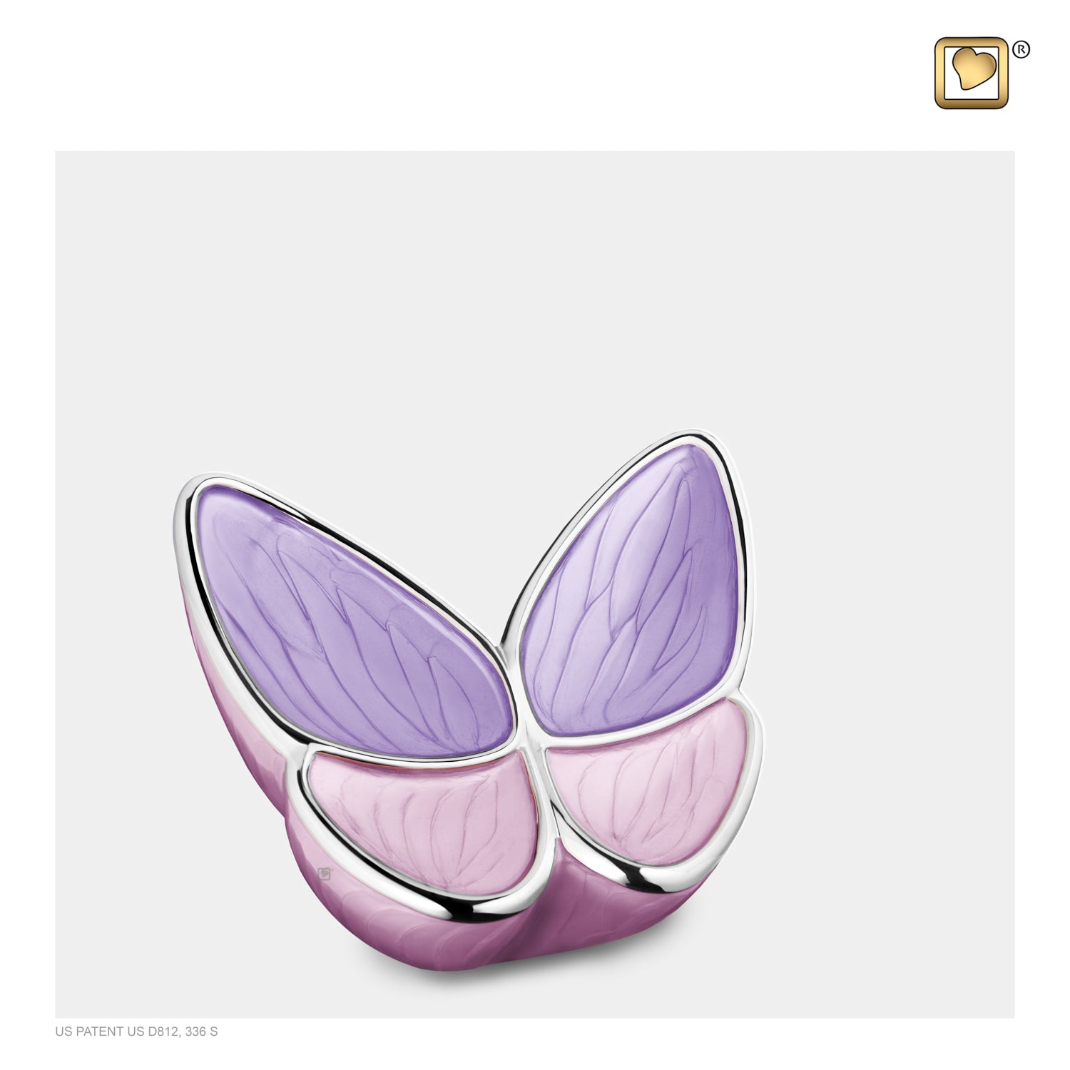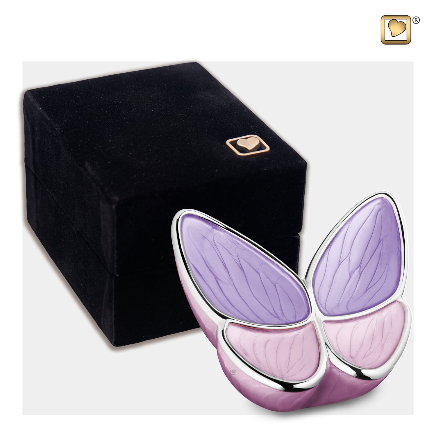 Meticulously crafted by skilled artisans from high-quality brass alloy, thiscremation urn captures the essence of transformation and freedom, much like a butterfly's flight. The keepsake’s elegant butterfly-inspired shape, adorned with a luminous Pearl Coat finish, reflects soft lavender and pink tones that radiate a calming presence. Each urn is Handcrafted with Love by LoveUrns, ensuring that every piece is crafted with the utmost care and attention to detail. The elegant, upward curve of the urn suggests an effortless ascent as if lifting toward the heavens, carrying the memory of a loved one along its spiritual journey.