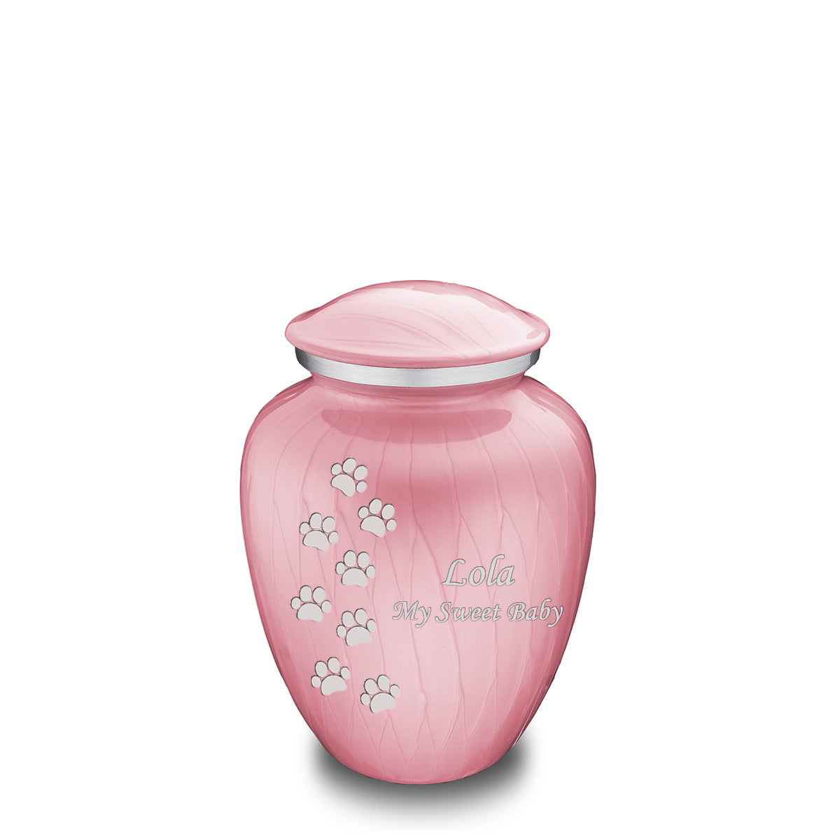 This Embrace Urn has a hand applied pearlescent pink finish with a brushed pewter band just below its threaded lid. The pink coloring represents joy, playfulness, and sweetness.