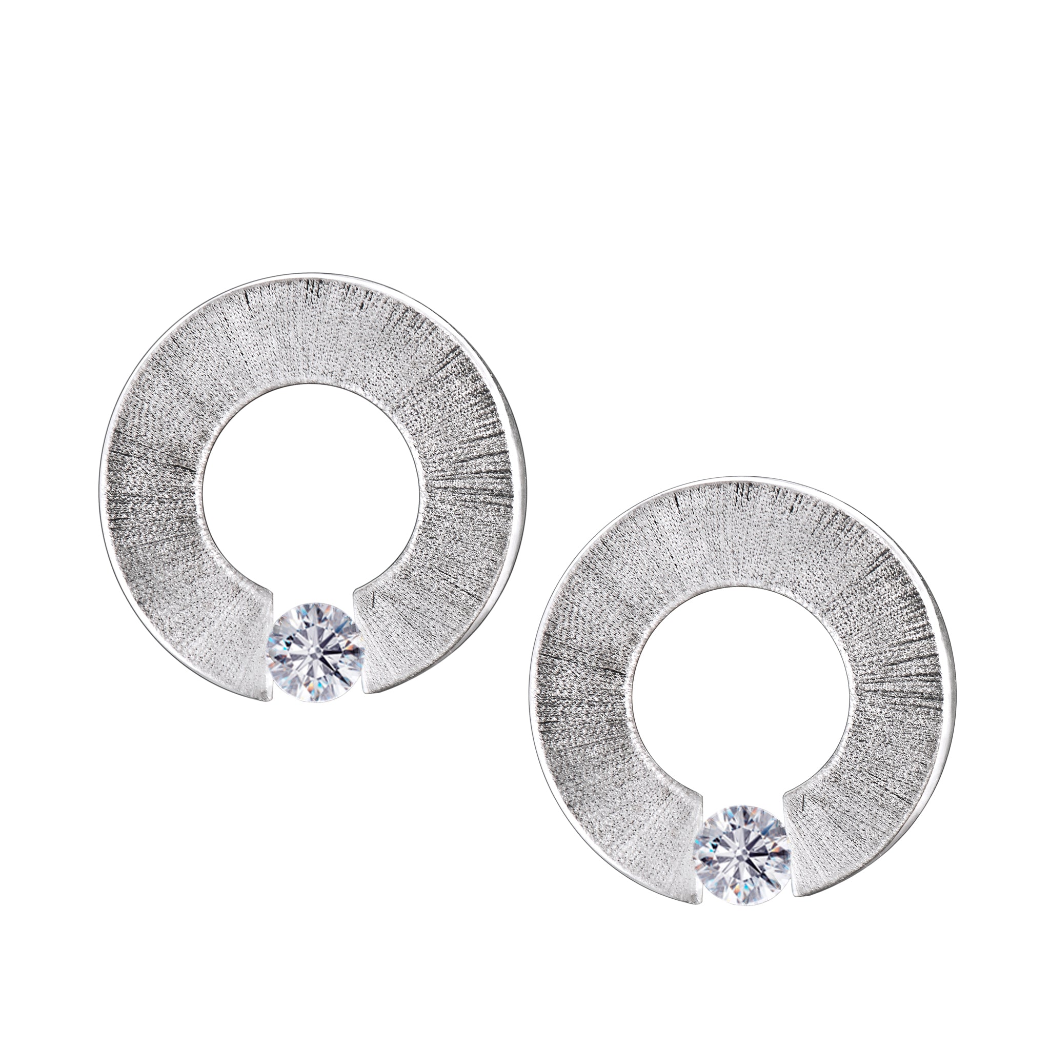 Composed of Sterling Silver with Rhodium plating, these earrings also have a hand placed clear crystal in the center.
