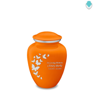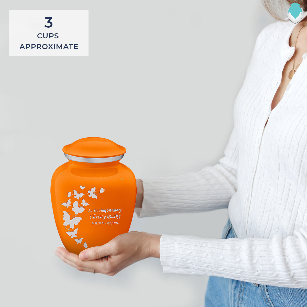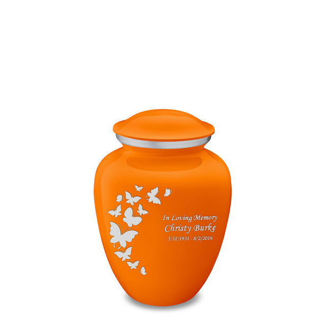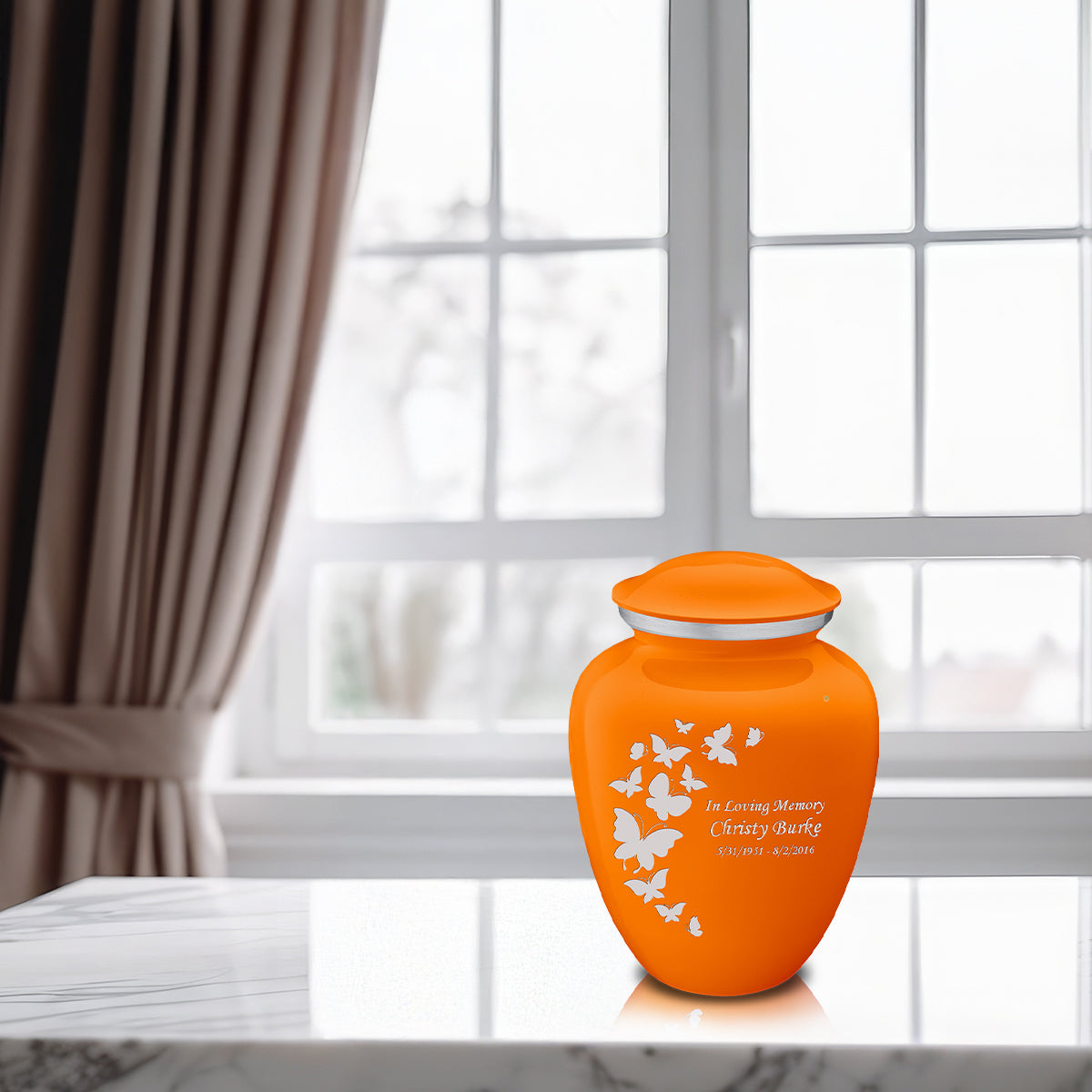 This Embrace Urn has a deep glossy burnt orange finish with a brushed pewter band just below its threaded lid. The burnt orange coloring represents transformation, creativity, and happiness..