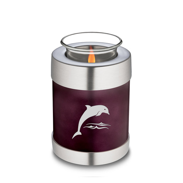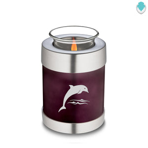 Honor the memory of your loved one with a Tealight Embrace Dolphins Cremation Urn for Ashes. This beautiful urn displays dolphins jumping into the ocean. The dolphins represent harmony, peace, and is the perfect resting place for someone fond of marine life or the ocean.