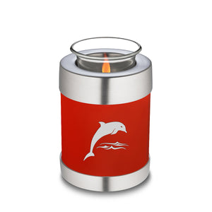 Honor the memory of your loved one with a Tealight Embrace Dolphins Cremation Urn for Ashes. This beautiful urn displays dolphins jumping into the ocean. The dolphins represent harmony, peace, and is the perfect resting place for someone fond of marine life or the ocean.