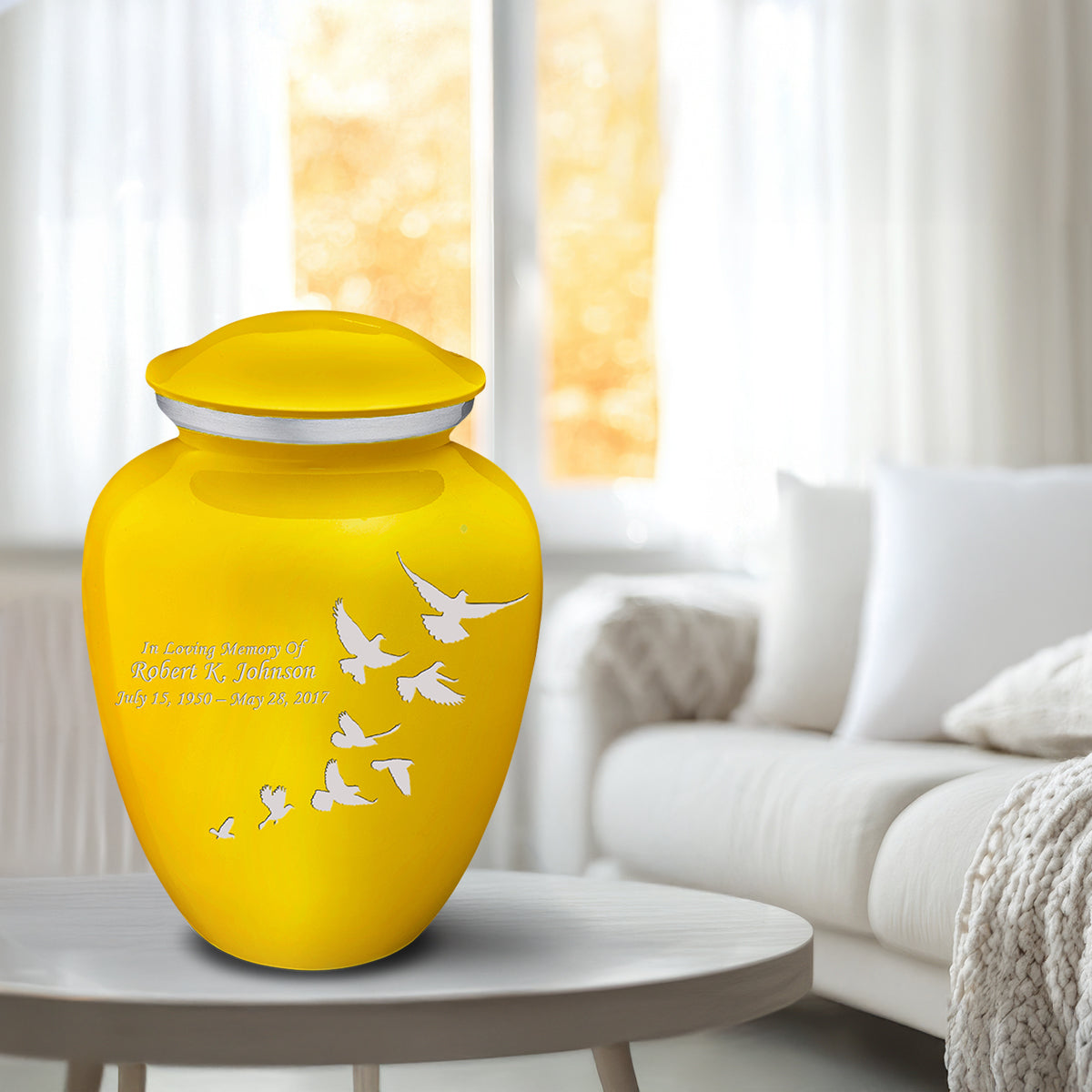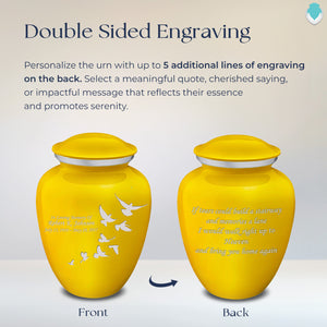 Honor the memory of your loved one with an Adult Embrace Doves Cremation Urn for Ashes. This beautiful urn displays a flock of doves flying upwards. This is a perfect resting place for someone who embodied freedom and peace.
