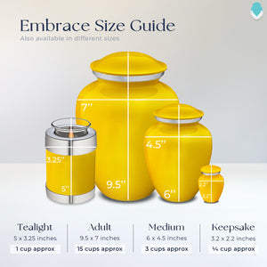 This Embrace Urn has a glossy yellow finish with a brushed pewter band just below its threaded lid.