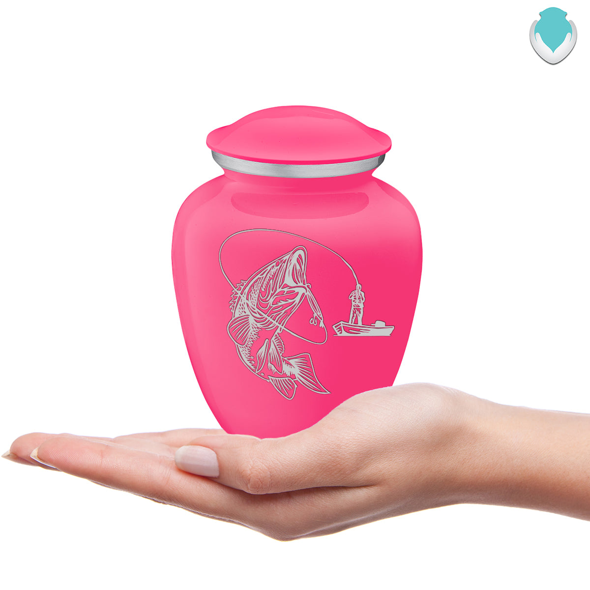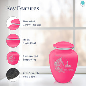 Honor the memory of your loved one with a Medium Embrace Fishing Cremation Urn for Ashes. This beautiful urn displays a scene of a fisher catching a prized fish. This is a perfect resting place for someone who embodied nature, peace, wisdom, and endurance.