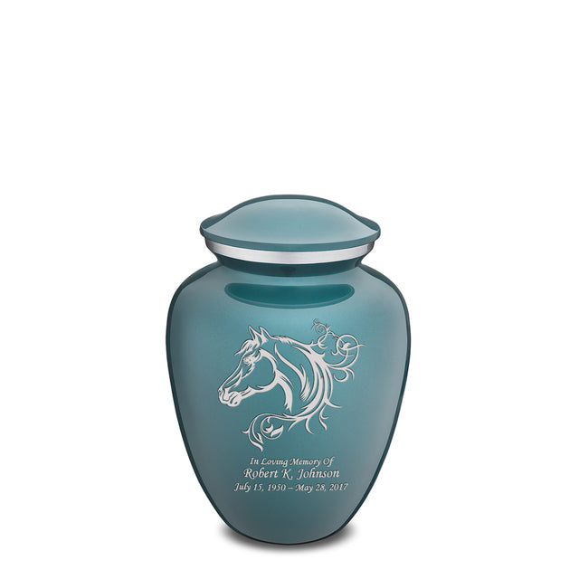 This Embrace Urn has an opaque glossy teal finish with a brushed pewter band just below its threaded lid. The teal coloring represents calmness, strength, and elegance.