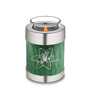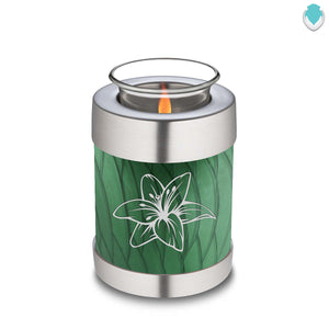 Celebrate the memory of your loved one with a Tealight Embrace lily Cremation Urn for Ashes. This beautiful urn displays a elegant lily. This is a perfect resting place for someone who embodied endurance, strength, and fortitude.