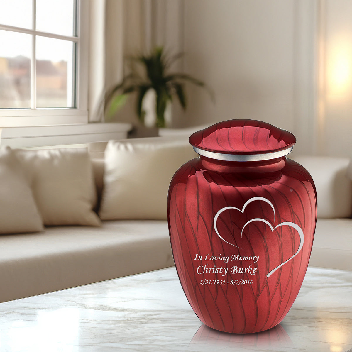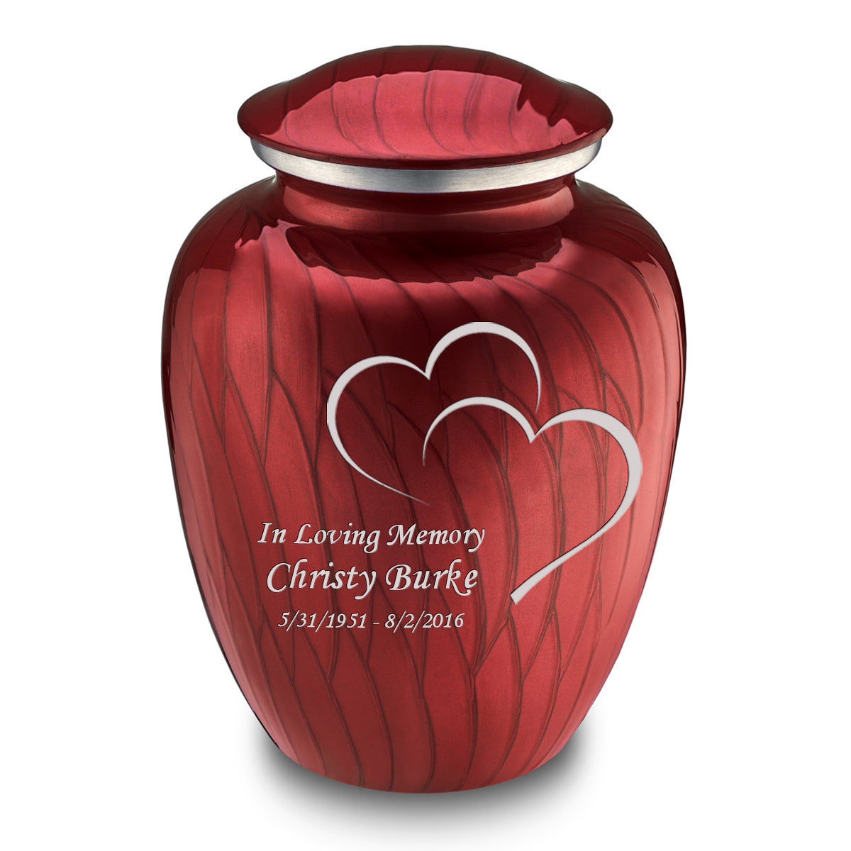This Embrace Urn has a hand applied pearlescent candy red finish with a brushed pewter band just below its threaded lid.